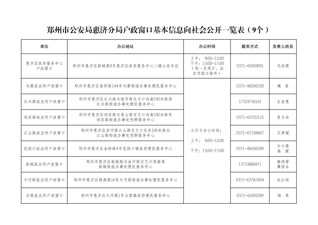 当前位置:首页>郑州>郑州市公安局惠济分局户政窗口基本信息向社会公开一览表(20260204)