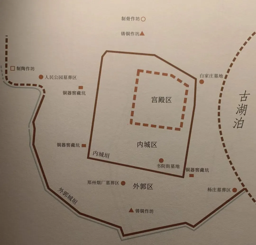 郑州商代遗址由占地约 3.25 平方千米的都城遗址(包括三重城垣遗址、宫殿区遗址)和分布在城外的手工业作坊区、居民区、墓葬区遗址组成,总占地面积约 25 平方千米。