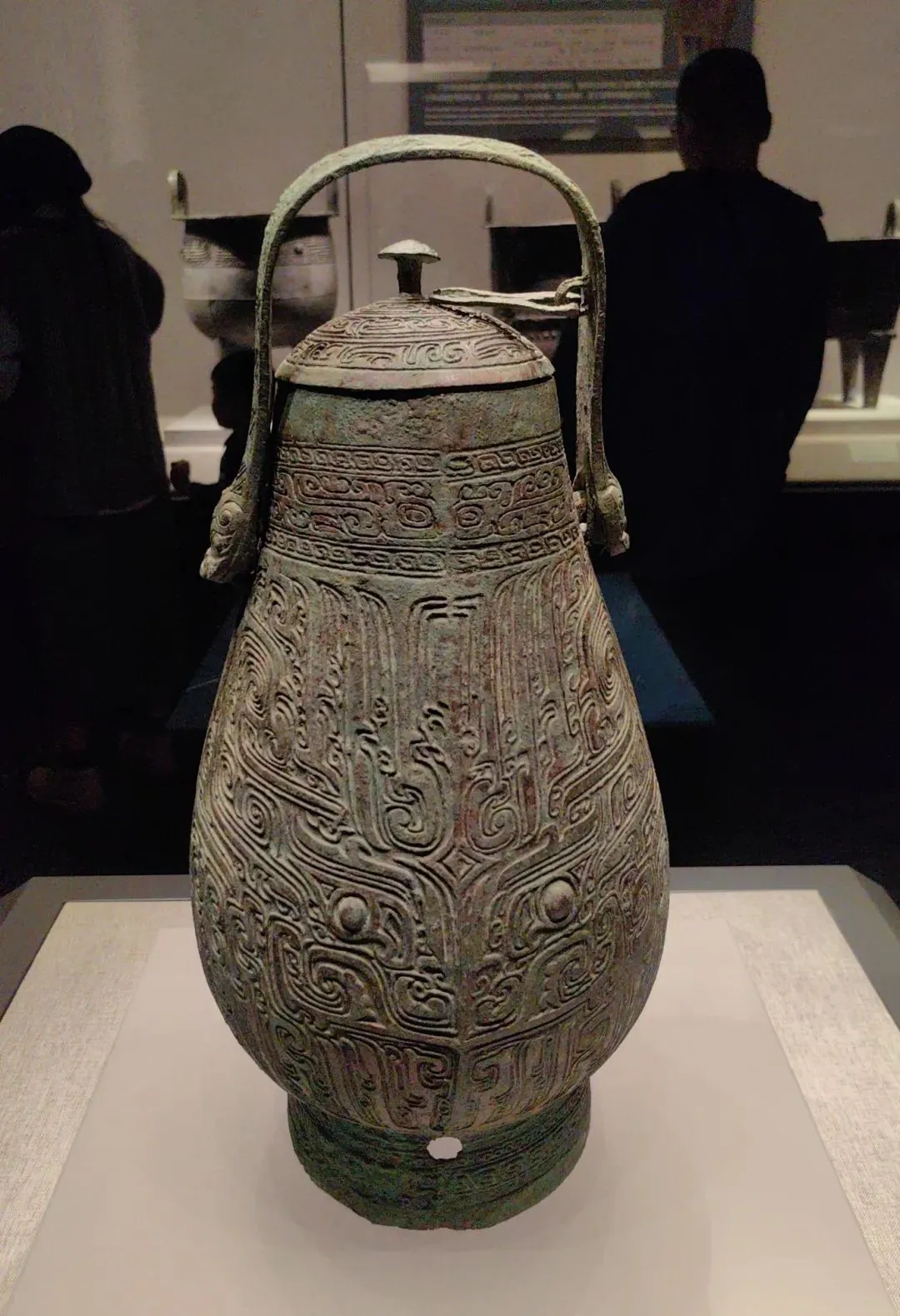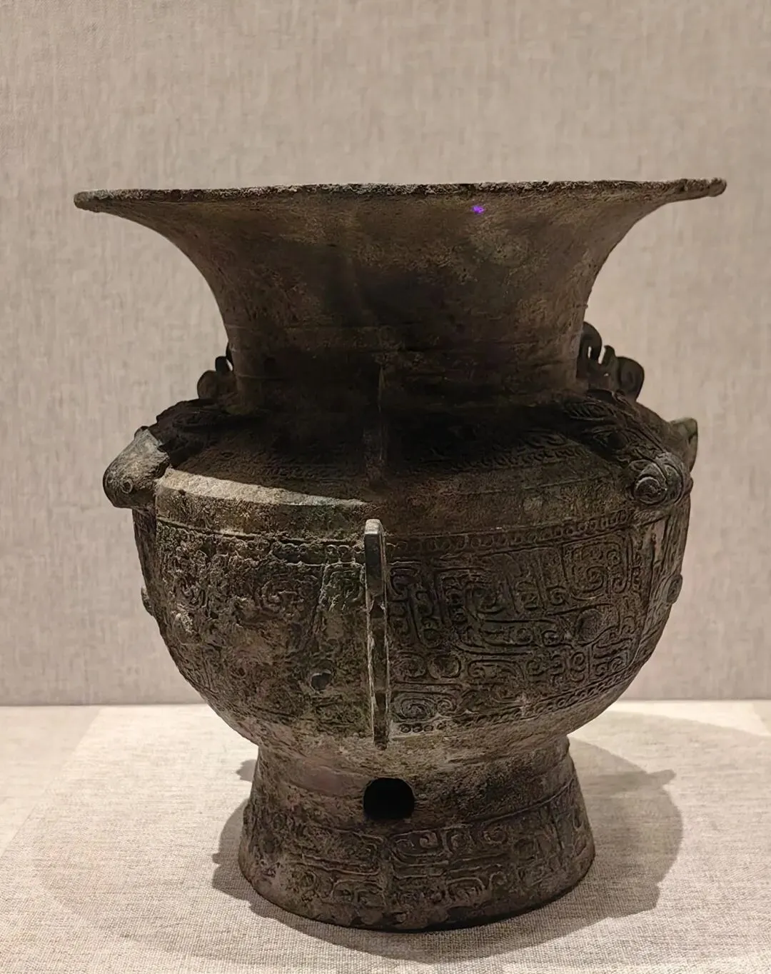 兽面纹提梁铜卣也出土于窖藏坑,通高 50 厘米,口径 12 厘米,圈足径 16 厘米,重 10.4 公斤。其体态修长,做工精美,器身呈圆形,盖隆起,顶部有菌形钮;器身小口,鼓腹下垂,腹上部有一对半环形钮,上连一个两端为蛇首的提梁,提梁一侧有一链与盖钮相连,圜底,圈足较高。该器盖钮饰涡纹,盖面饰夔纹,器身由上至下为雷纹、夔纹、兽面纹、连珠纹等,极富特色。