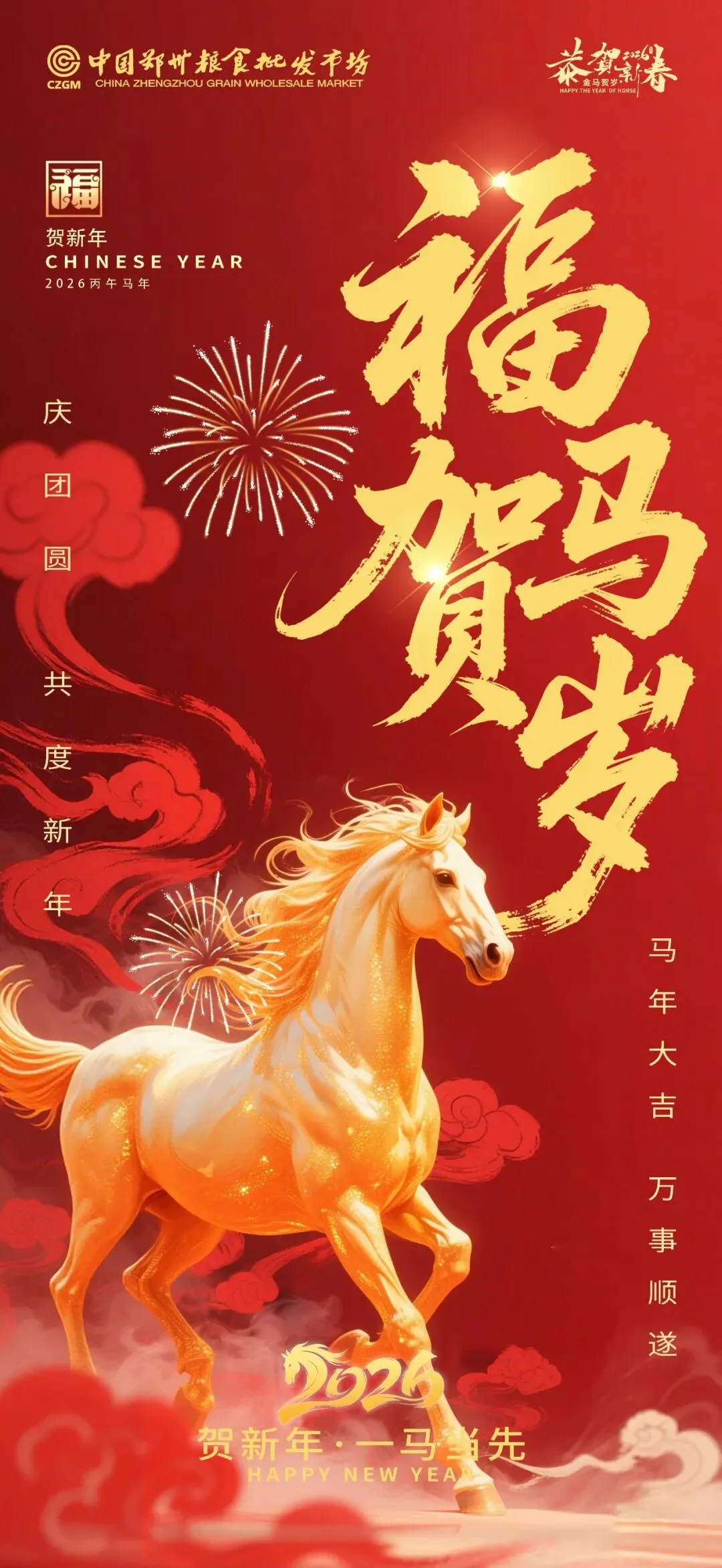 值此2026年农历丙午马年新春佳节到来之际,郑州粮食批发市场有限公司向长期以来关心支持郑州粮批发展的各级领导、合作伙伴及各界朋友,向公司全体职工、离退休老同志和全体职工家属,致以最诚挚的节日问候与最美好的新春祝福!