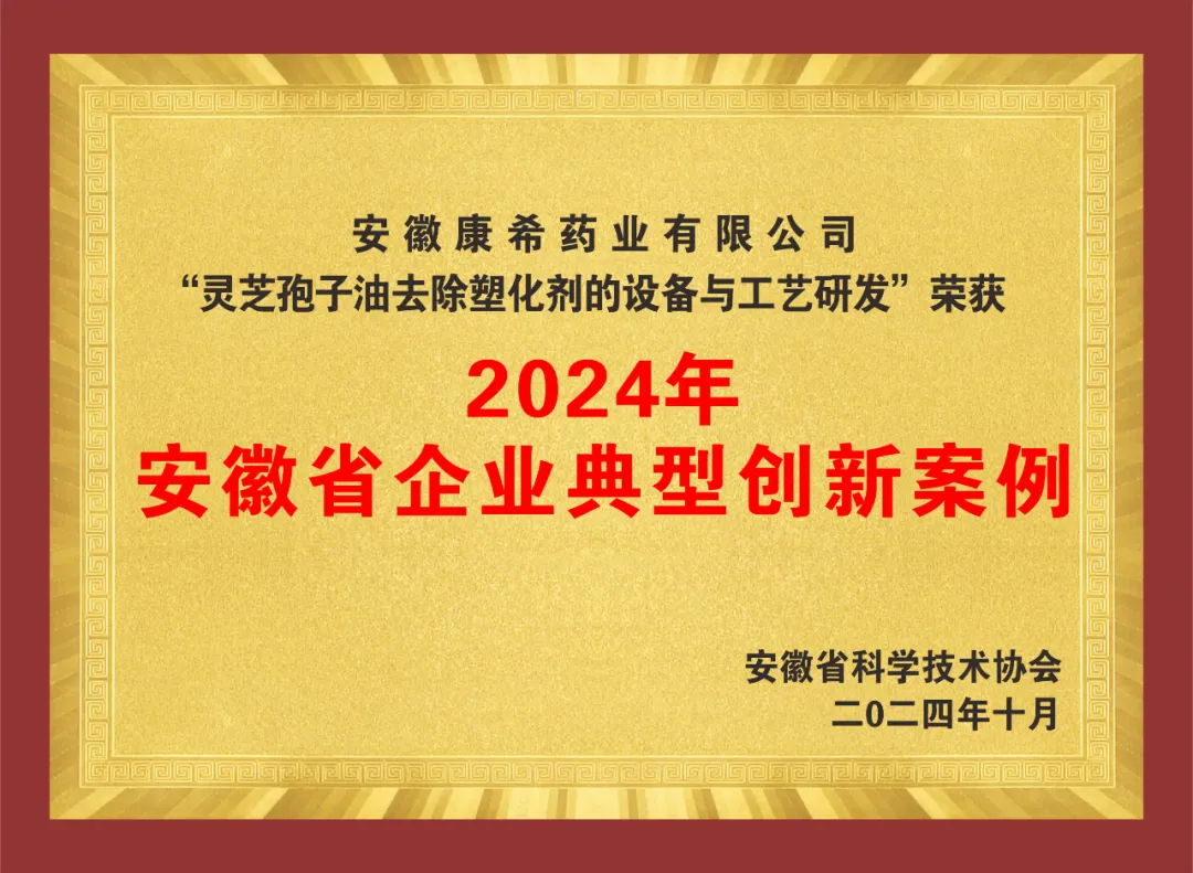 安徽康希药业有限公司自研“499”全品质提升技术——《灵芝孢子油去除塑化剂的设备与工艺研发》获得2024年安徽省企业典型创新案例