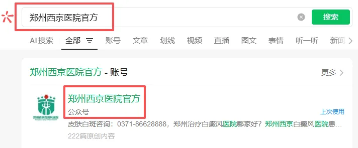 打开微信,进入“发现”页面,点击“公众号”,搜索【郑州西京医院官方】,点击关注;