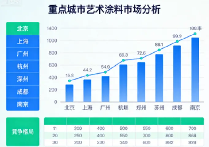 这类城市,是区域艺术涂料市场的“龙头”,依托自身的区位优势、产业基础或消费潜力,占据区域市场主导地位,虽不及TOP5城市的规模和高端化程度,但市场稳定性强,利润空间可观,是中小企业突围的重要方向,也是头部品牌下沉的重点区域。