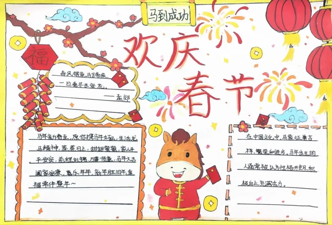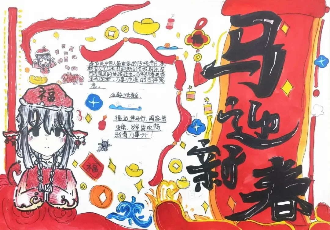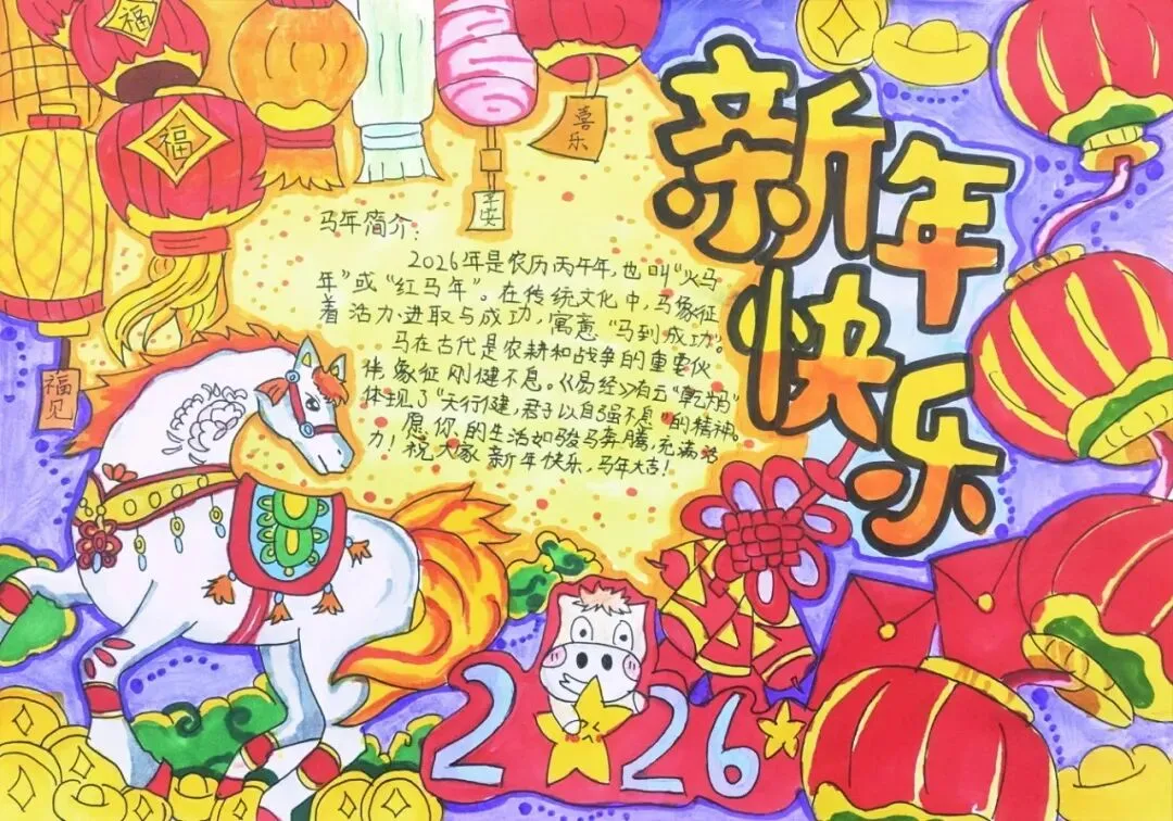 以笔为媒,以画传情。孩子们围绕“马年春节”主题绘制创意小报,将马年寓意、传统习俗、吉祥寄语与新春心愿融入版面。卡通马的灵动、红灯笼的喜庆、春联的雅致跃然纸上,色彩鲜活、创意十足的作品,既是对春节文化的生动诠释,也是孩子们对新年的美好憧憬。