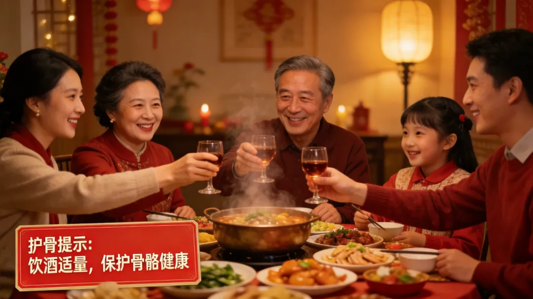 ·年夜饭别贪酒:除夕家宴,美酒助兴,但饮酒过量会影响钙的吸收,还可能导致骨质疏松,甚至增加跌倒、骨折的风险,同时也可能加重关节负担。建议大家适量饮酒,多喝温水、茶水,守护骨骼与关节健康。