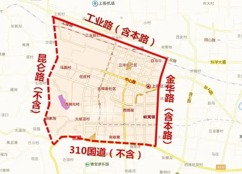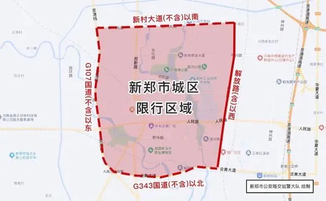 新郑市城区:G107国道以东、新村大道以南、解放路以西、G343国道以北(原炎黄大道)(不含G343国道、新村大道、G107国道)。