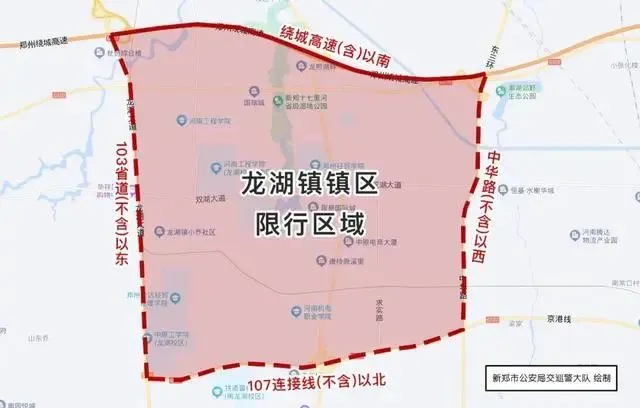 龙湖镇镇区:103省道(原107国道)以东、绕城高速以南、中华路以西、107连接线以北区域的所有道路(不含103省道、107连接线、中华路)。