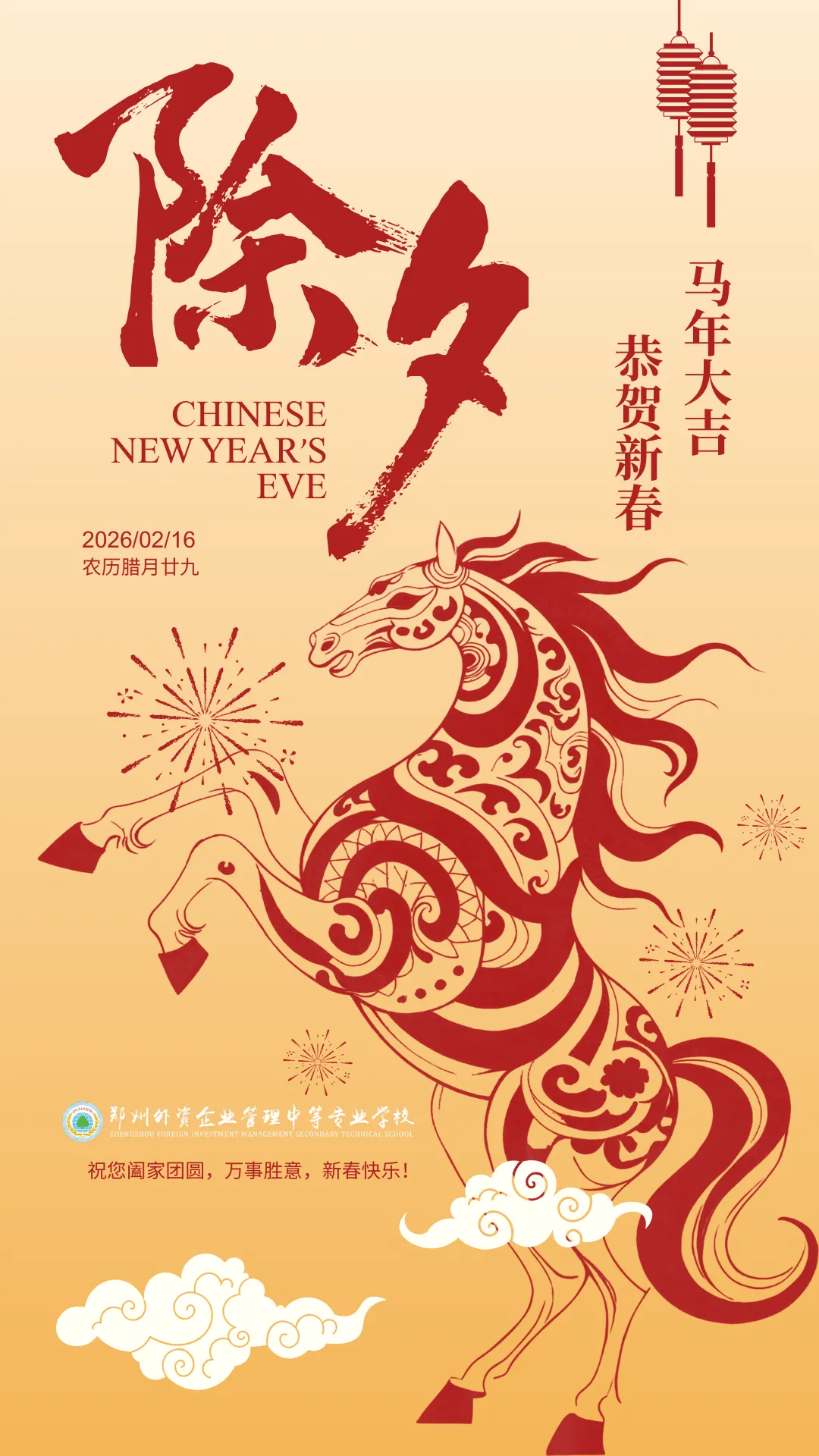 律回春渐,新元肇启。值此除夕佳节,郑州外资企业管理中等专业学校向全校师生员工及广大家长,致以最诚挚的节日问候和美好祝福!