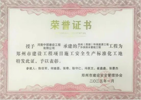 郑州(西部)环保能源工程厂外供排水管线工程喜获“郑州市建设工程项目施工安全生产标准化工地”荣誉称号。