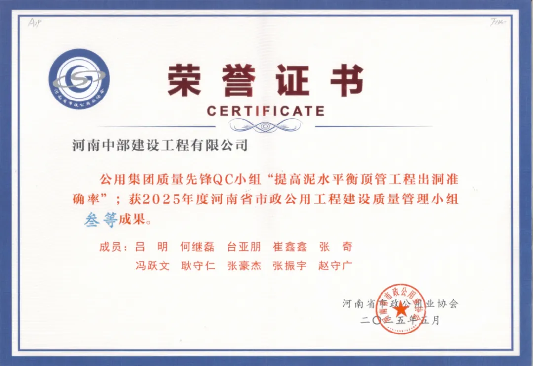 中部建设QC小组“提高泥水平衡顶管工程出洞准确率”获2025年度河南省市政公用工程建设质量管理小组叁等成果,“提高SIA Wb自锚管道接口安装质量一次验收合格率”获2025年度河南省市政公用工程建设质量管理小组叁等成果。