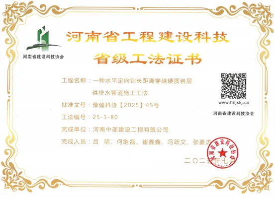 中部建设研发的“一种水平定向钻长距离穿越硬质岩层供排水管道施工工法”获得河南省建设科技协会“河南省工程建设科技省级工法证书”。