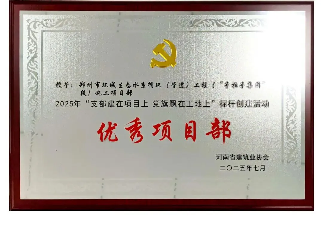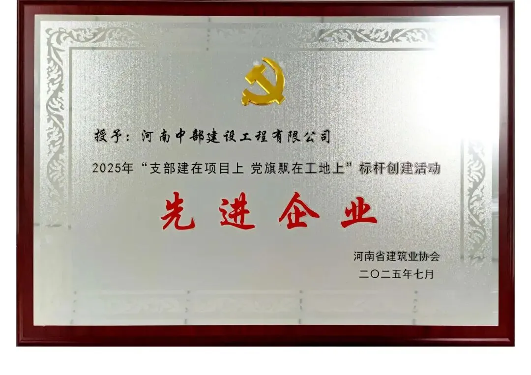 中部建设荣获河南省建筑业协会颁发的2025年度“支部建在项目上 党旗飘在工地上”标杆创建活动“先进企业”,水循环项目部荣获“优秀项目部”称号。