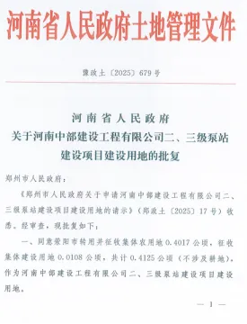 郑州(西部)环保能源工程厂外供排水管线工程取得《河南省人民政府关于河南中部建设工程有限公司二、三级泵站建设项目建设用地的批复》。