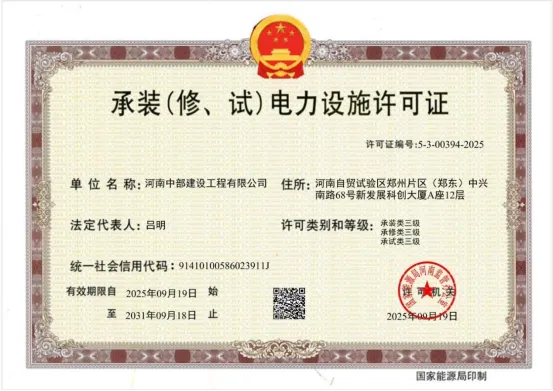 中部建设取得承装(修、试)电力设施许可证三级资质。