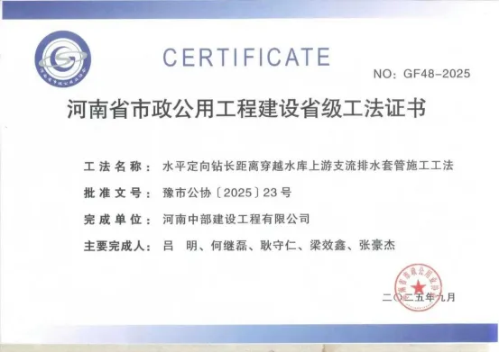 中部建设申报的“水平定向钻长距离穿越水库上游支流排水套管施工工法”,荣获河南省市政公用工程建设省级工法证书。