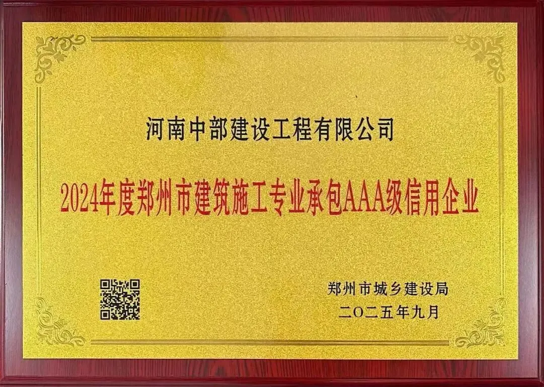 中部建设被郑州市城乡建设局评为“2024年度郑州市建筑施工专业承包AAA级信用企业”。