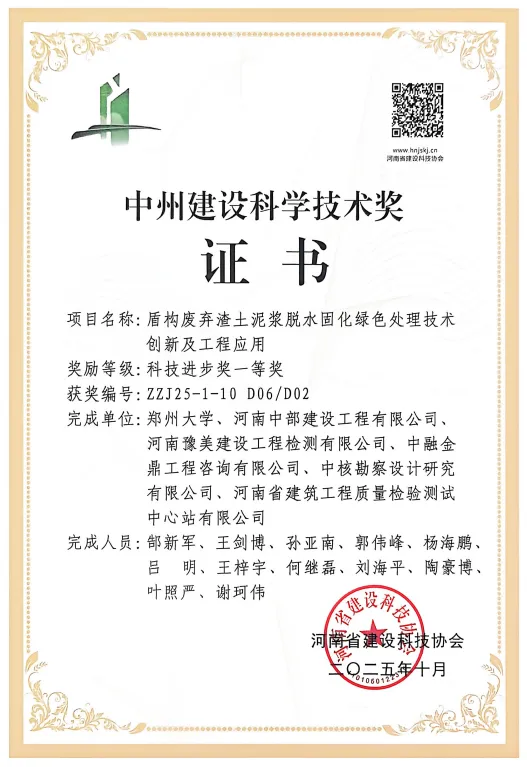 中部建设研发的“盾构废弃渣土泥浆脱水固化绿色处理技术创新及工程应用”获得河南省建设科技协会中州建设科学技术奖科技进步奖一等奖证书。