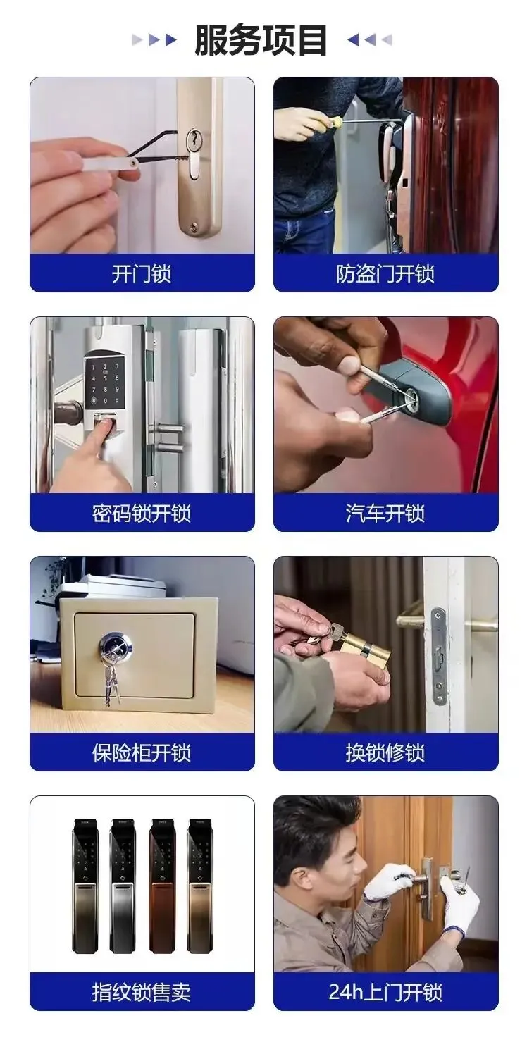 🔑 民用开锁:防盗门、卧室门、指纹锁、密码锁无损开启🚗 汽车开锁:轿车、SUV、商务车等各类车型快速解锁🔐 换锁服务:更换锁芯、升级C级防盗锁、安装智能门锁🏢 商业开锁:办公室门锁、玻璃门、文件柜开启🧰 应急处理:钥匙断锁内、反锁门、锁芯卡顿等问题💡 门禁维修:门禁系统故障排查、刷卡锁更换维护