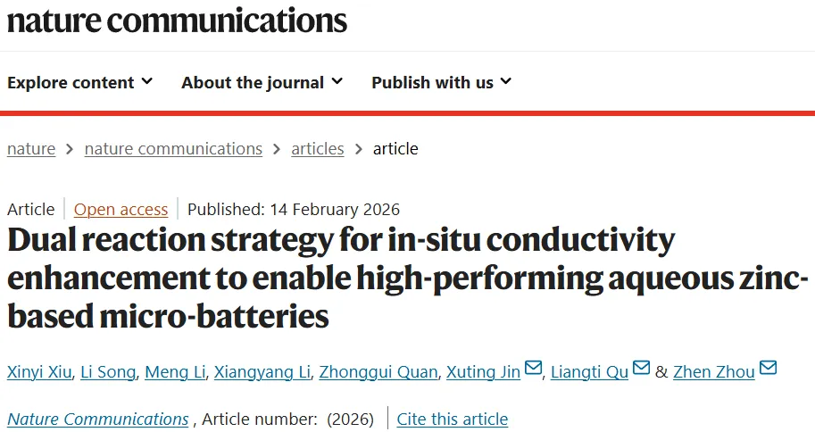 2026年2月14日,清华大学曲良体,郑州大学靳绪庭,周震在国际知名期刊Nature Communications发表题为《Dual reaction strategy for in-situ conductivity enhancement to enable high-performing aqueous zinc-based micro-batteries》的研究论文,Xinyi Xiu,Li Song为论文共同第一作者,曲良体,靳绪庭,周震为论文共同通讯作者。