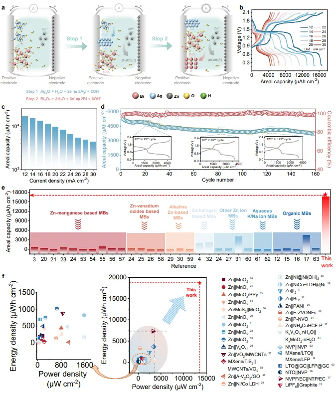 图3:Zn||Bi2O3@Ag2O微电池的电化学性能。(a)充放电过程两步反应机理示意图;(b)12-30mA cm-2电流密度下容量保持3473.8-16561.5μAh cm-2;(c)高倍率性能优于各类水系锌基微电池;(d)160次循环后容量保持70.1%;(e)面容量超越所有报道的水系锌基、碱金属离子及有机微电池;(f)能量密度-功率密度图显示本工作在高功率下仍保持~19000μWh cm-2,是有机微电池的2.5倍以上。