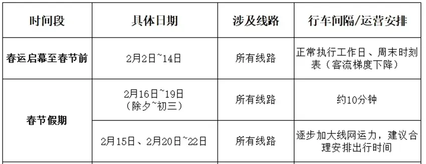 昨天起至2月19日,郑州地铁各线路行车间隔约10分钟。2月20日至2月22日,地铁各线路逐步加大线网运力资源,请市民乘客合理安排出行时间。