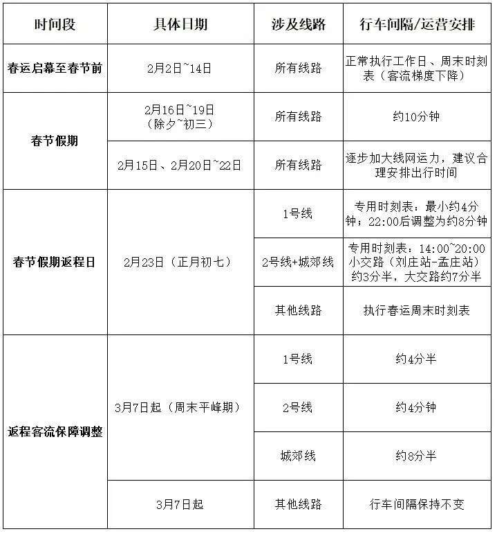 2月23日(正月初七)春节假期返程日,地铁1号线、2号线与城郊线使用专用时刻表,1号线最小行车间隔约4分钟,22:00后行车间隔调整为约8分钟;2号线与城郊线14:00~20:00小交路调整为刘庄站至孟庄站,小交路行车间隔约3分半,大交路行车间隔约7分半;其他线路执行春运周末时刻表。