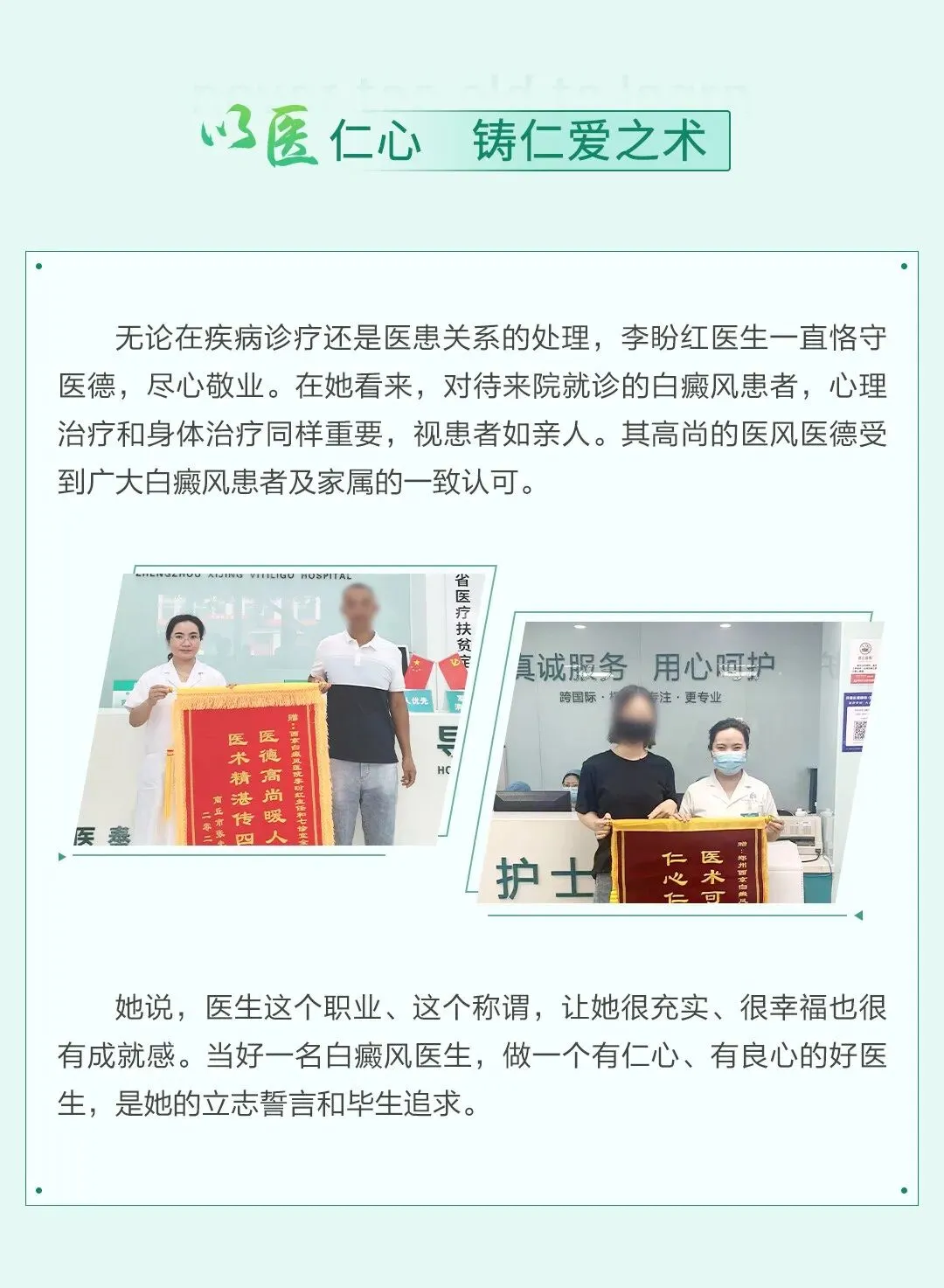 医者仁心,术精于专,李盼红主任会跟其他医生一起,用专业帮大家走出祛白的困境。