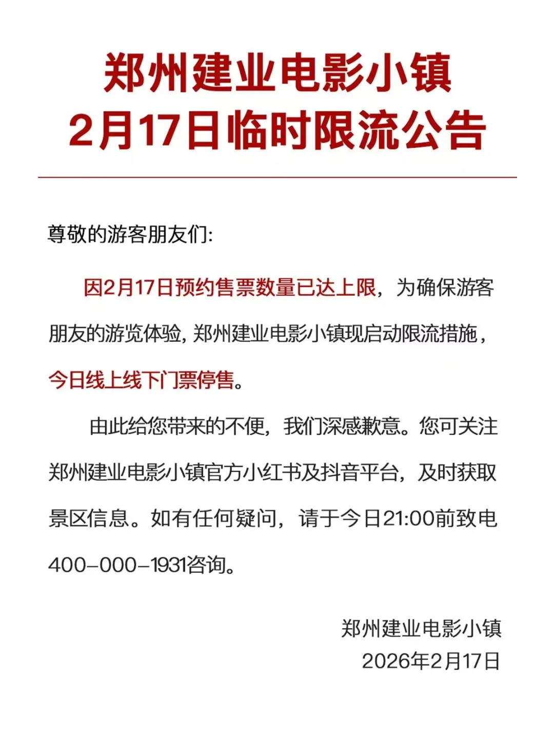因2月17日预约售票数量已达上限,为确保游客朋友的游览体验,郑州建业电影小镇现启动限流措施,今日线上线下门票停售。