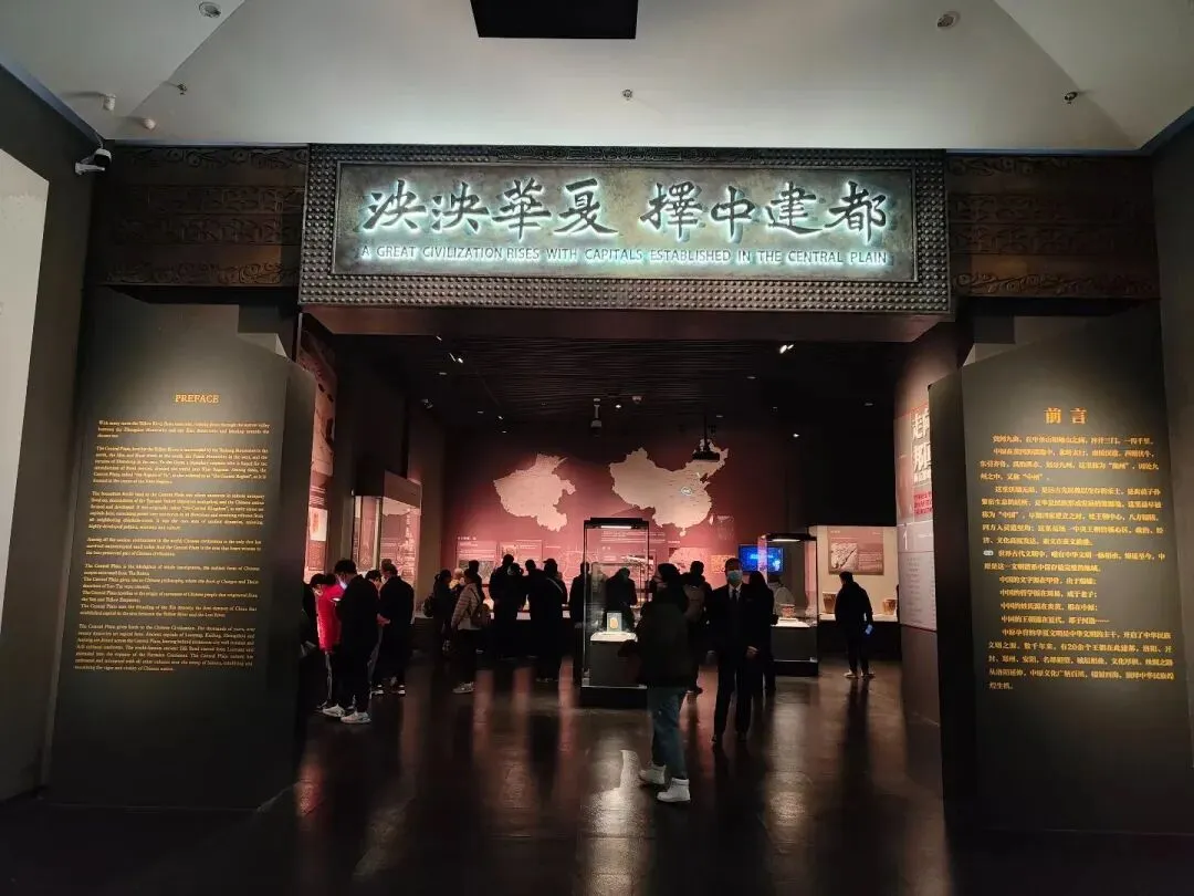 以中原建都历史为主线,共分十个展厅,系统呈现从新石器时代至宋金元的文明演进历程。“走向邦国——新石器时期”展厅展示了从裴李岗文化、仰韶文化到中原龙山文化的发展脉络,重点文物包括彩陶双连壶。“中原立国——夏商时期”展厅以二里头、郑州商城、安阳殷墟等为核心,展现早期国家形态,重点文物有兽面纹夔足方鼎。“宅兹中国——西周时期”展厅阐释“择中建都”理念与礼制成熟,重点文物包括“长子口”簋形觥、王子午鼎。“逐鹿中原——东周时期”展厅反映列国争霸与文化多元,重点文物有错金豹形器座、汉白玉舞人佩、四神云气图、始皇廿六年诏书权。“帝国霸业——秦汉魏晋南北朝时期”两个展厅,分别呈现秦汉一统下的帝国气象与魏晋南北朝的民族融合,重点文物包括人形柱三层绿釉陶水榭、彩绘舞蹈伎乐陶俑群、七盘舞画像砖、黄釉乐舞人物扁壶、武则天除罪金简。“盛世华章——隋唐时期”两个展厅,展示隋唐东都洛阳的繁荣与开放包容的时代精神,重点文物有三彩人物凤首壶、绿釉六博俑、三彩骑马吹排箫俑。“东京梦华——宋金元时期”两个展厅,表现北宋东京城的繁盛与宋金元的文化艺术成就,重点文物有彩绘仆侍陶俑群、石刻头像、三彩琉璃塔、三彩童子傀儡戏枕。尾厅对中原文化的历史地位与持续活力进行了总结。