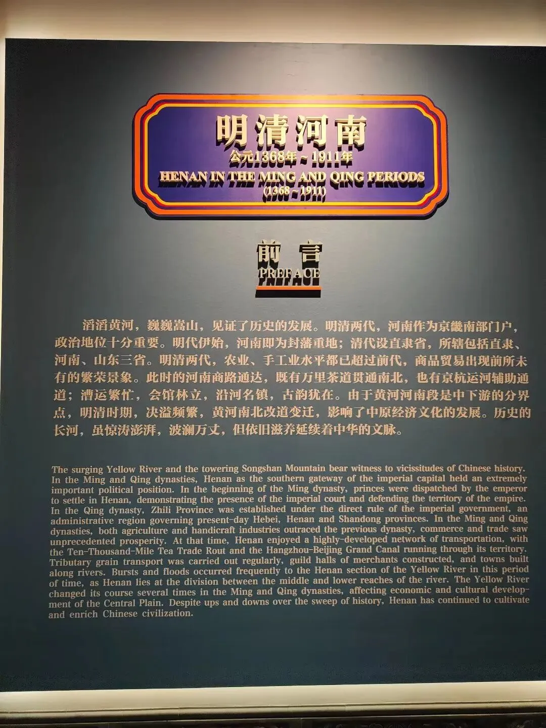 从“鼎革相承——明清政治措施”、“漕舟竞驶——明清社会经济的发展与繁荣”、“文脉绵长——明清河南文化”三个部分,梳理了明清两代河南的政治地位、经济发展与文化面貌。重点文物与展品包括《饥民图说》木印雕板、青花云龙纹玉壶春瓶、建筑构件、独角兽铜熏炉、彩绘铜俑、陶制明器三进式四合院、工艺精湛的金首饰、户部官票、大清宝钞、王铎草书长卷。