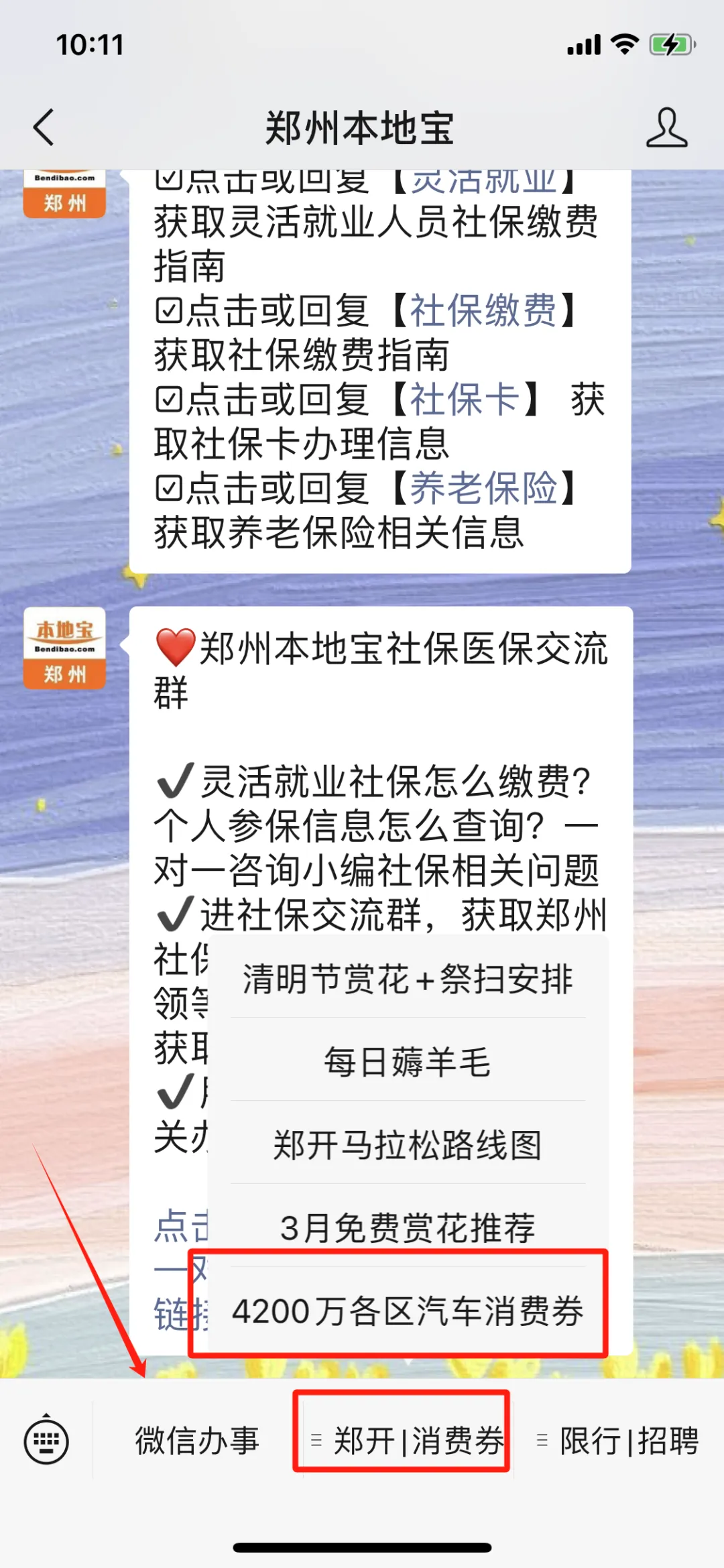 ➤可以在下方菜单栏点击微信办事,郑开|消费券,限行|招聘获取你想看的内容: