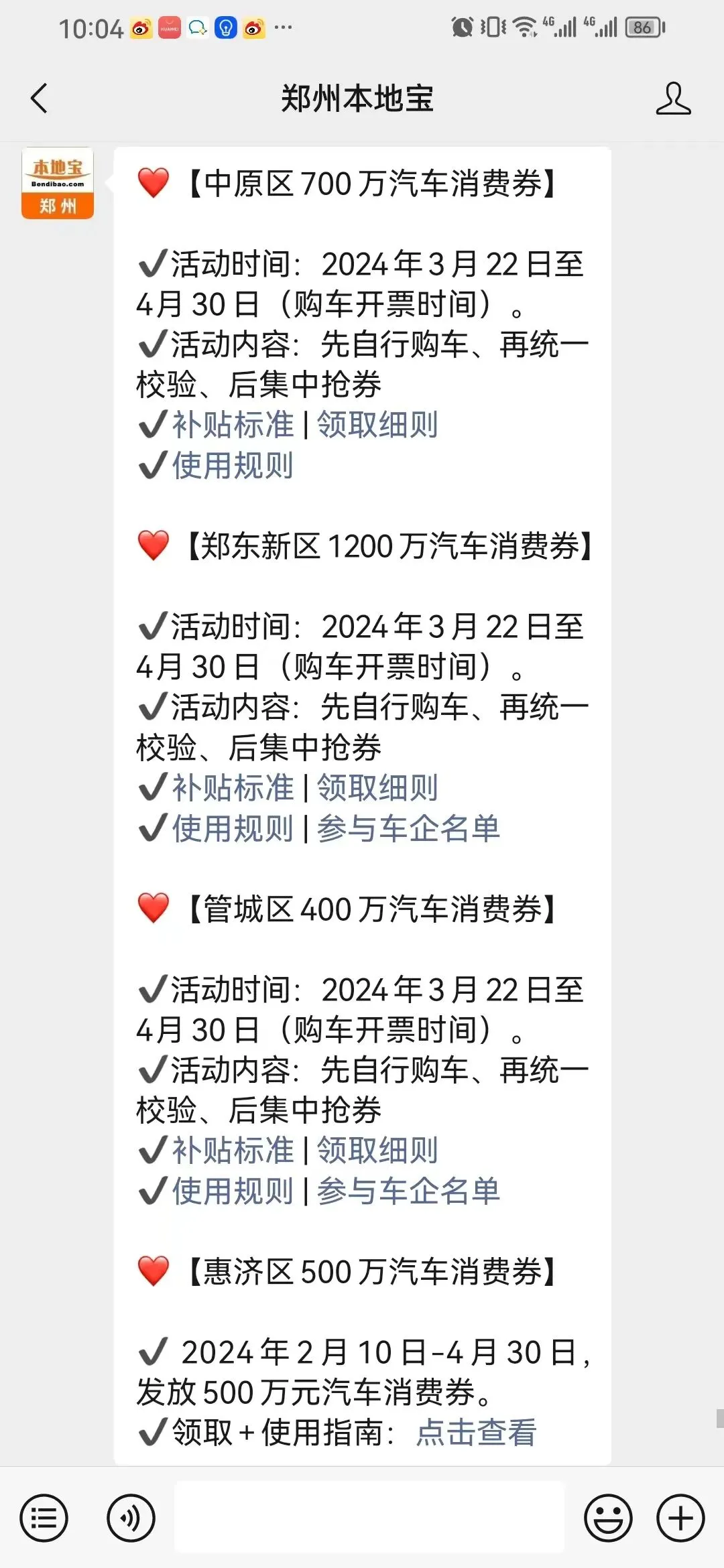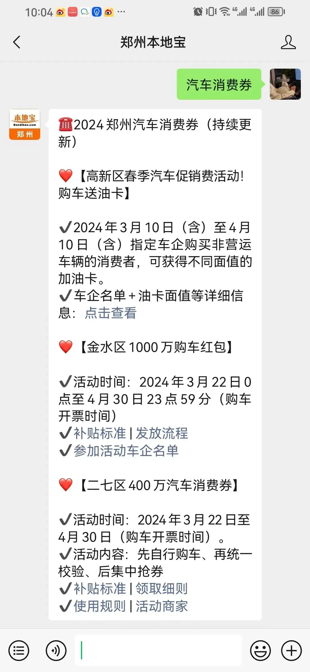 在【郑州本地宝】在对话框回复【汽车消费券】