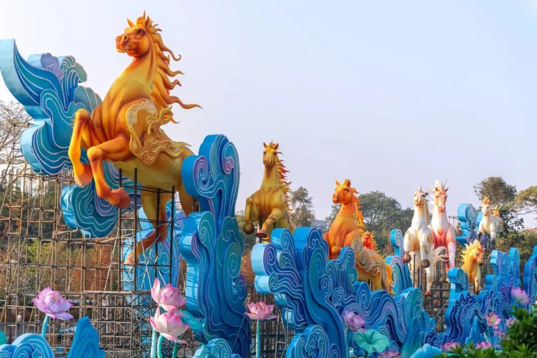 ⭐亮点:本次春节花灯以“天中骏影・万象腾辉”为主题,依托园区自然景观,精心布置30组大型灯组,串联起六大主题展区