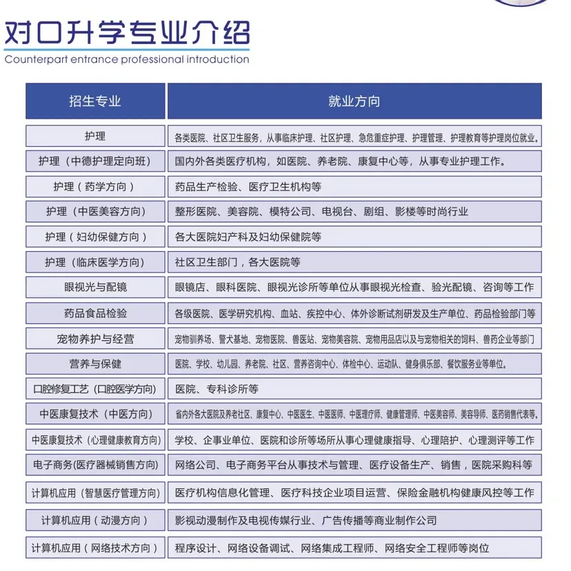 (1)护理(ICU方向)、(2)护理(药学方向)、(3)护理(眼视光方向)、(4)护理(中医美容方向)、(5)护理(妇幼保健方向)、(6)护理(社区卫生管理方向)、(7)护理(食品药品检验方向)、(8)护理(宠物养护与经营方向)、(9)营养与保健、(10)口腔修复工艺、(11)中医康复技术(心理健康教育方向)、(12)中医康复技术(中医方向)、(13)电子商务(医疗器械销售方向)、(14)计算机应用(动漫方向)、(15)计算机应用(网络技术方向)、(16)计算机应用(大数据方向) 护理属于国控专业,进行订单培养,为国家培养栋梁之才。