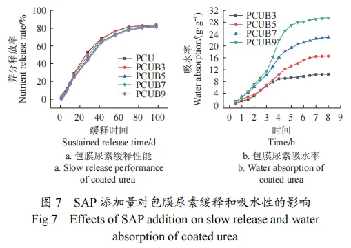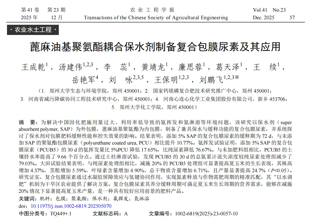 为解决中国因化肥施用量过大、利用率低导致的氨挥发和氮淋溶等环境问题,该研究以保水剂(super absorbent polymer, SAP)为外包膜,蓖麻油基聚氨酯为内包膜,制备了兼具保水与缓释功能的复合包膜尿素,并系统探讨了保水剂对包膜肥料缓释性能和控失效果的影响。