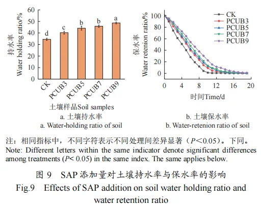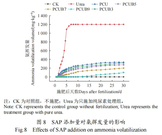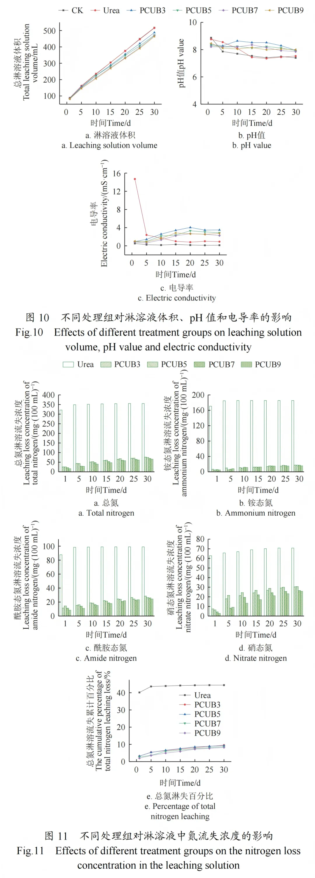 结果表明,添加5% SAP的复合包膜尿素的缓释期为72 d,与未添加SAP的聚氨酯包膜尿素(polyurethane coated urea, PCU)相比提升10.77%。氨挥发试验证明,添加5% SAP的复合包膜尿素(PCUB5)的30 d的氨挥发量比5%PCU降低17.65%,比纯尿素降低76.67%。与未加肥料组相比,PCUB5的土壤持水率提高了9.66个百分点。通过土柱淋溶试验,发现PCUB5的30 d的总氮累计流失浓度较纯尿素处理组减少了79.03%。