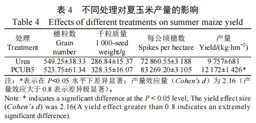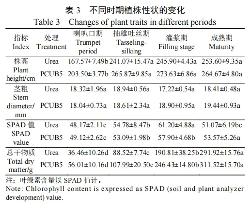 大田试验结果表明,与纯尿素处理组相比,减施20%的PCUB5处理组可显著提高夏玉米的生长表现,其株高增加4.37%,茎粗增加5.59%,叶绿素含量增加4.90%,总干物质含量增加6.71%,且产量显著提高24.7%(P<0.05)。