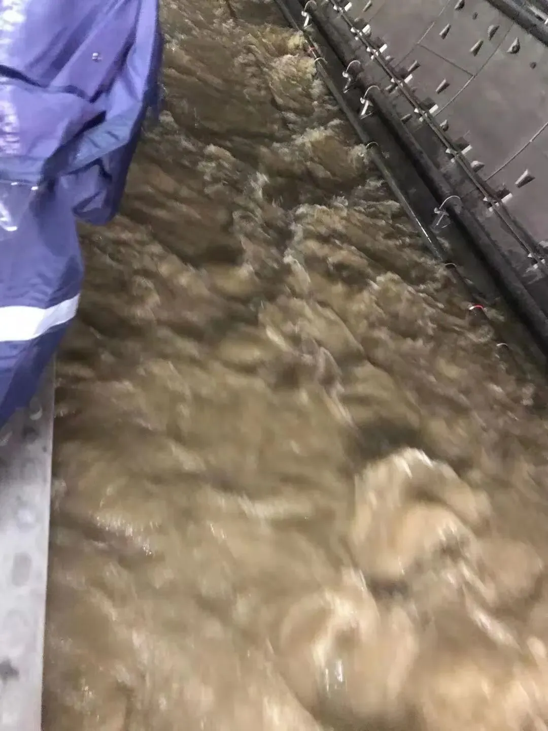 最后一共开了两扇门,一个是驾驶室里平时工作人员走的那一扇,还有第一节车厢的门。我们都是从驾驶室那个门走出去的。我们走出去的位置,台阶上的水已经涨到了小腿,隧道中间跟一条小河差不多,水流得很快,特别夸张。看到水流时,我一开始还比较淡定,但是大家已经有些慌了,不断有人开始喊“快点走”,声音此起彼伏。那个时候,我有一点害怕了,怕水涨得太快。