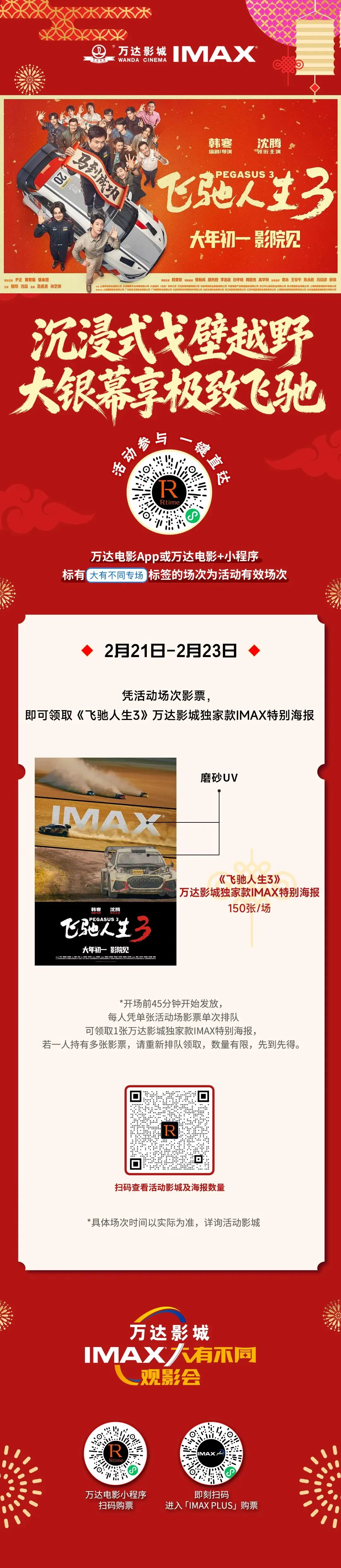 1️⃣ 《飞驰人生3》IMAX专属海报 · 限量开抢⏰ 领取时间:2月18日 15:55(IMAX厅)🎁 福利详情:50张IMAX专属海报,严格遵循“一票一张”规则;若一人持有多张影票,需重新排队领取,数量有限,先到先得!⏰适用场次:《飞驰人生3》《镖人》《惊蛰无声》所有标注“活动场”的场次🎁 福利详情:每场限量50张海报,严格遵循“一票一张”规则;若一人持有多张影票,需重新排队领取,数量有限,先到先得!📍 参与方式:万达影城APP/小程序购买《镖人》影票 🎁 福利详情:购票即有机会获得万达电影独家阿育娅海报,数量有限,先到先得,武侠迷必冲! 🎁 福利详情:严格遵循“一票一张”规则;若一人持有多张影票,需重新排队领取,数量有限,先到先得!5️⃣凭《熊出没年年有熊》影票,可至检票口领取精美周边:刮刮卡课程表或者书签一个,数量有限先到先得