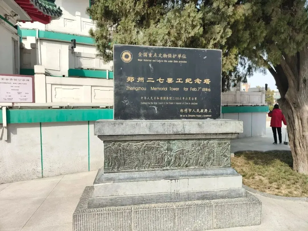 郑州二七罢工纪念塔是为纪念此次工人运动而修建的标志性建筑,坐落于郑州市中心的二七广场,此处原为郑州铁路工人领袖汪胜友、司文德等烈士的牺牲地。纪念塔于1971年7月1日动工,同年9月29日落成,其前身为20世纪50年代修建的一座高21米的木制灯塔,该木塔在民间已被自发地与二七历史相联系。