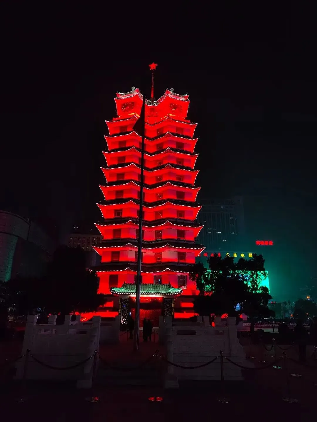 新建成的纪念塔为钢筋混凝土结构,其建筑平面呈两个五边形并联,构成独特的联体双塔造型。塔体总高63米,共14层(含地下室与塔基)。塔基为三层石栏环绕的阅台,塔身共11层,每层顶角为仿古挑角飞檐,覆以绿色琉璃瓦。塔顶建有钟楼,内置六面直径2.7米的大钟,报时演奏《东方红》乐曲。钟楼顶端矗立一根高9米的混凝土旗杆,上置红色五角星。塔内设有旋梯与展室,游客可登临塔顶俯瞰市容。