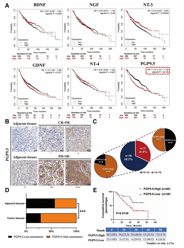 临床样本中,神经标志物 PGP9.5 高表达与淋巴结转移、病理分级升高及 PD-L1 表达相关,患者总生存期显著缩短,肿瘤组织神经浸润程度高于癌旁组织。