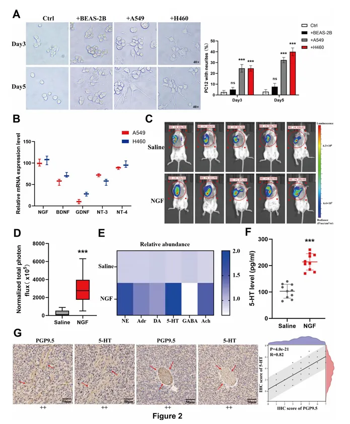 NSCLC 细胞分泌 NGF,诱导 PC12 细胞轴突生长,小鼠模型中注射 NGF 显著增加肿瘤体积及 PGP9.5 表达,抑制 NGF 可阻断神经浸润。