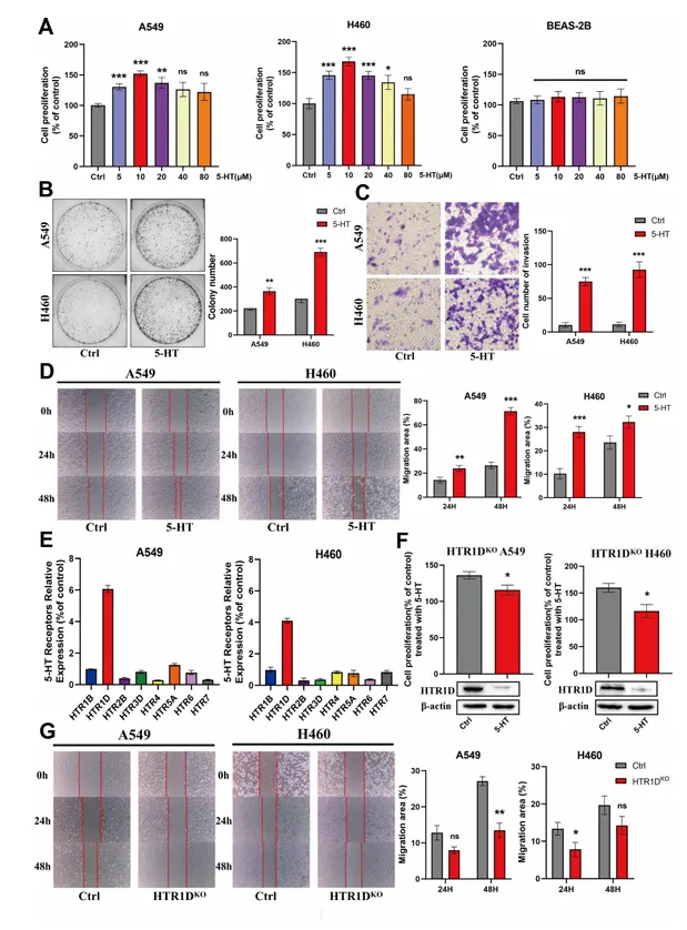神经浸润显著升高肿瘤组织 5-HT 水平,且 5-HT 与 PGP9.5 表达正相关,5-HT 通过 HTR1D 受体促进 NSCLC 细胞增殖、迁移及克隆形成。