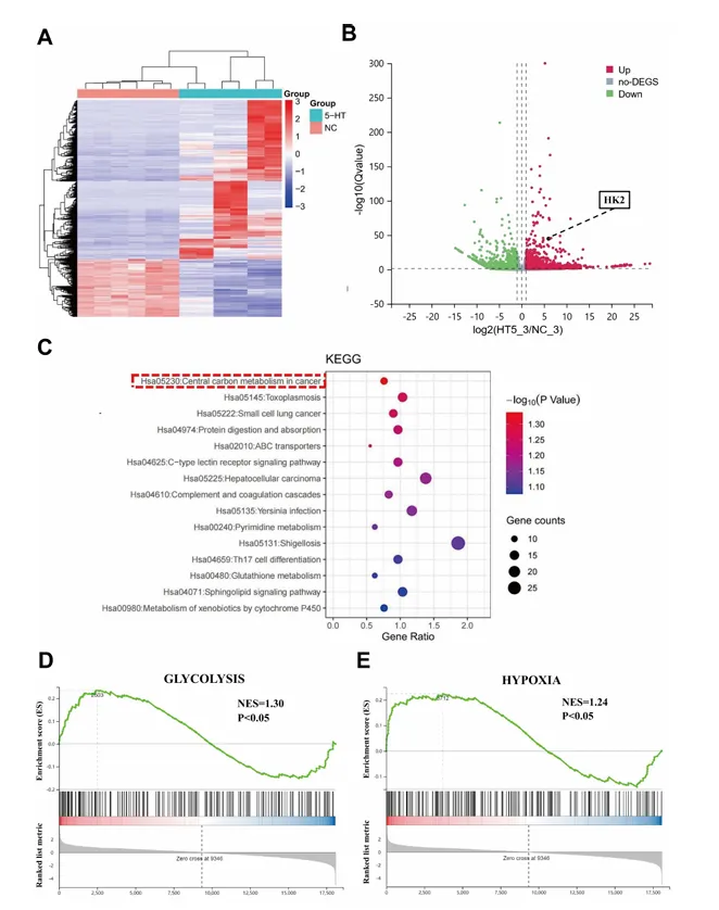 转录组分析显示 5-HT 显著富集糖酵解通路,上调 HK2、LDHA 等关键酶表达,提升 ECAR 水平,PI3K/mTOR 抑制剂可逆转该代谢重编程。