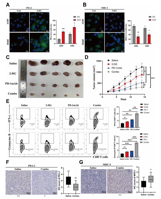 5-HT 上调 PD-L1、下调 MHC-I 表达,联合 2-DG(糖酵解抑制剂)与 PD-1 单抗治疗,显著缩小肿瘤体积,增强 CD8+ T 细胞功能。
