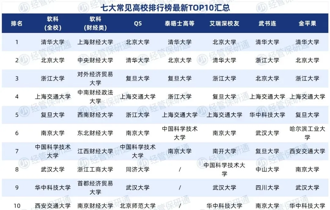 保研角逐中,选准目标院校是迈向成功的关键一步。小通汇总了七大榜单的TOP10高校,在不同标尺下,哪些学校表现更好呢?经管er如何找到最适合自己的榜单呢?