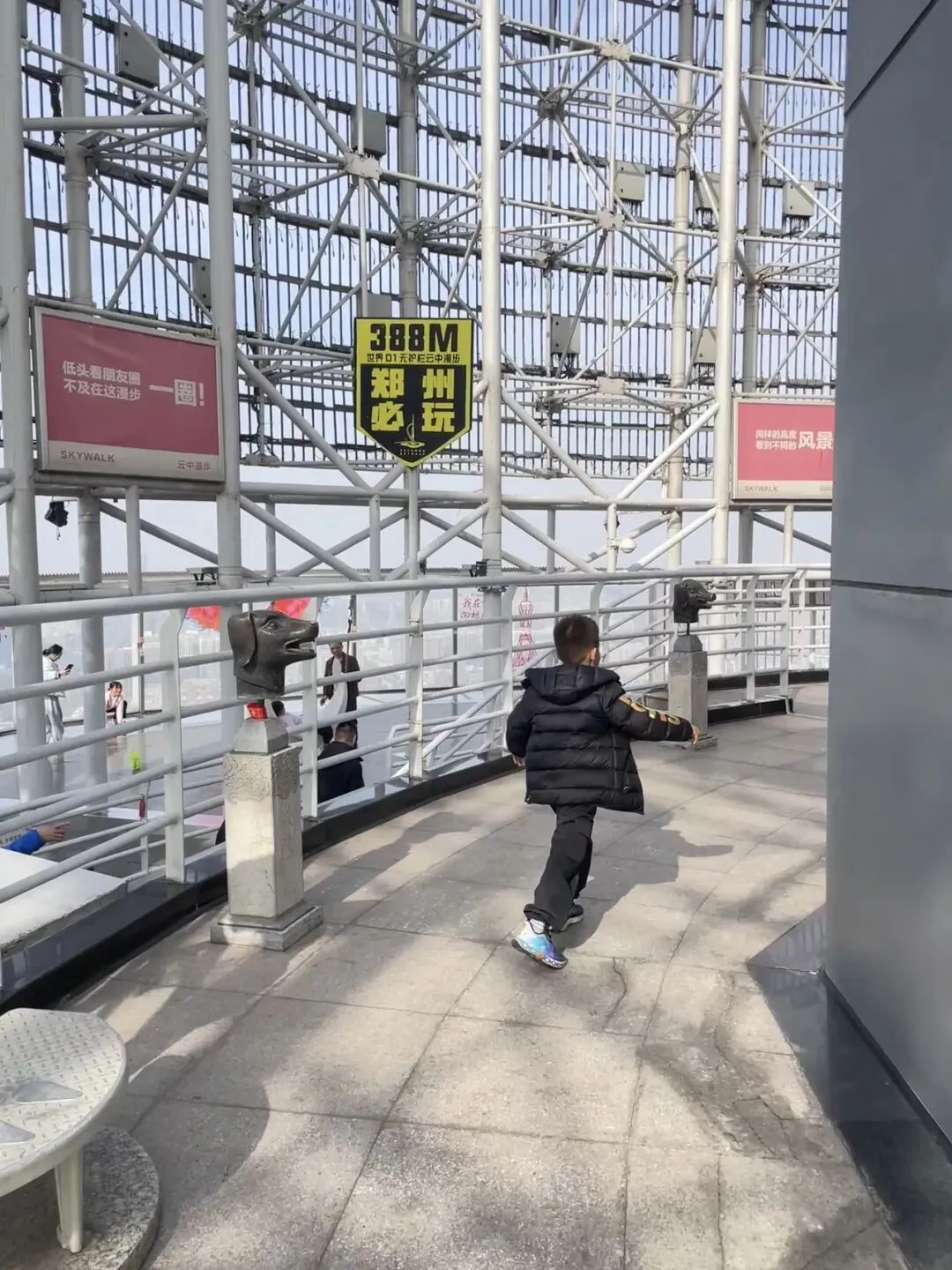 看土城墙建造过程的展示,儿子满怀欣喜,或许是本能,亦或许孩子对土的兴趣透着女娲造人中人类泥土文明的密码。 郑州的最后一站是中原福塔,登上99层往下看,对我这个恐高患者还是挺刺激的!有点腿麻!确切的说,我看着他爷俩沿着玻璃窗走,我都腿麻!他们若无其事。🤦🏻♀️