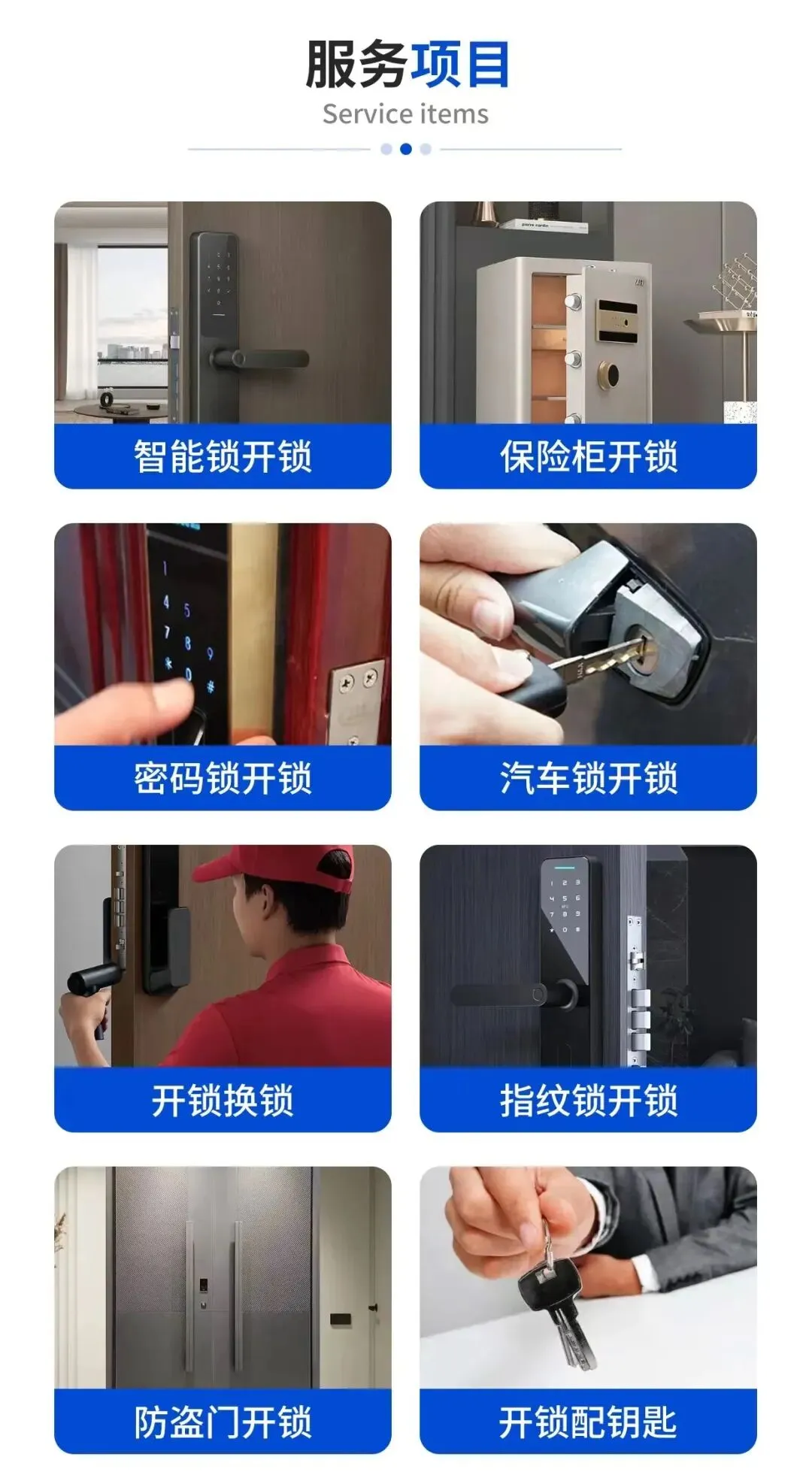 🛠【服务内容】✅ 防盗门开锁 / 无损开锁技术✅ 更换锁芯 / 升级超B级、C级锁芯✅ 指纹锁安装 / 智能锁维修✅ 汽车开锁 / 配汽车钥匙✅ 保险柜开锁维修✅ 门锁维修 / 门体调试✅ 商铺卷帘门锁维修✅ 小区门禁系统安装与维护