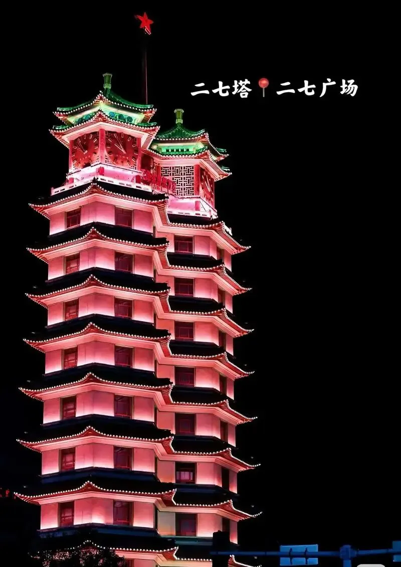 二七塔在灯火辉煌中屹立,德化街热闹非凡,如意湖畔霓虹闪烁,共同织就了一幅绚丽多彩的画卷。